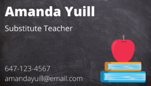 What information should you include on your business card as a Substitute Teacher? Of course, you will have a business card; this is not ridiculous – this is 2023! Teachers, principals and office administrators all keep the business cards of their favourite substitute teachers and pull them out and text them when they need a sub! Your business cards should include the pertinent information and be easy to read (i.e., a simple design that is not too busy – nobody is going to call you because you have a cool 3D design and it smells like cinnamon).